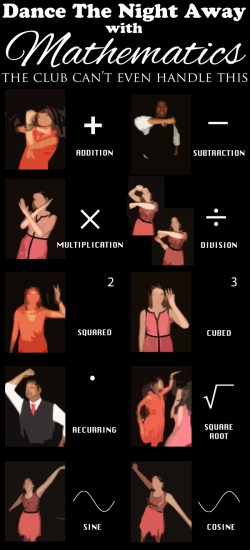 Another from Geeks Are Sexy: The Math Dance. Wave your geek flag high on the dance floor, dearies! Here is a visual guide.