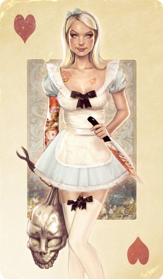 Alice has Alice-themed tattoos. That’s how she rolls in this illustration by DeviantArt user StephStamb. (This totally reminds me of the first room in the Haunted Mansion at Disney World.) (via UFUNK)