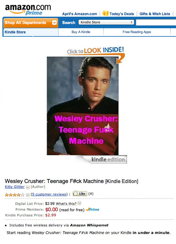 Quoth Wil Wheaton: “I don’t have to read ‘Wesley Crusher, Teenage Fuck Machine’, Dottie. I lived it…. well, except for the fuck machine part.” You, however, can read it and buy it at Amazon. (via Regretsy)