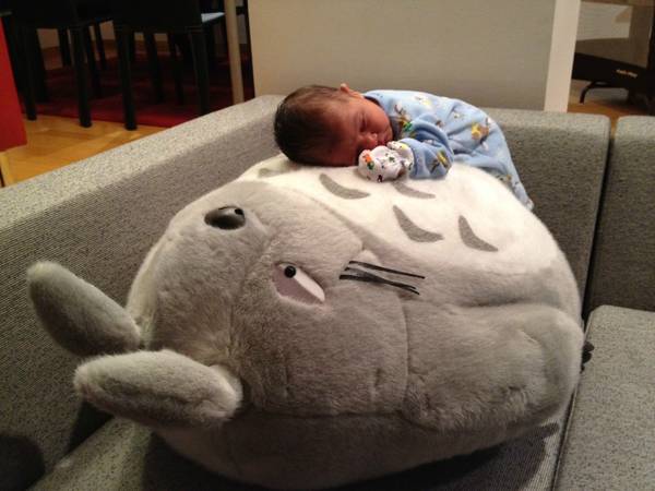 Reddit also delivers this precious pic taken by Honestly_. That is a tiny baby, taking a nap on a giant, plush Totoro. (via Boing Boing)