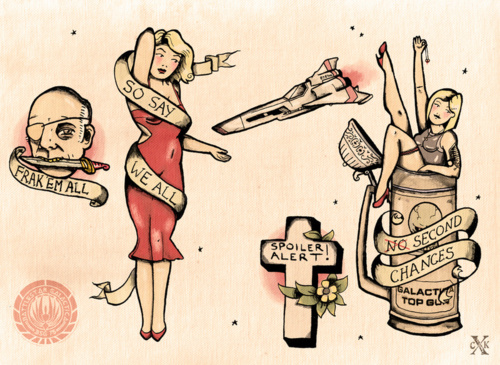 Cassie Kelly is behind this Battlestar Galactica flash, and if anyone plans on actually getting it tattooed on themselves, email us immediately at tips at themarysue dot com. (via Diary of a Death Starlette)