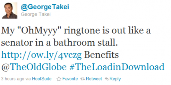 George Takei‘s signature “Ohhh, myyy!” is available as a ringtone, and every time it’s purchased, proceeds go towards The Old Globe theater. If you aren’t following George Takei on Twitter, you are missing out. (As you can see.) (via Geeks Are Sexy)