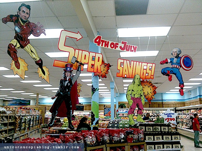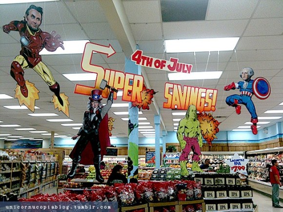 Megan Lee of Unicornucopia found this display by Jesse Draper in a Trader Joe’s and here’s what I say: Today, we are all Avengers. Or Founding Fathers. Or Founding Mothers. Whatever you’d like to be, just don’t handle lit fireworks. Happy Independence Day, everyone! (via Uproxx)