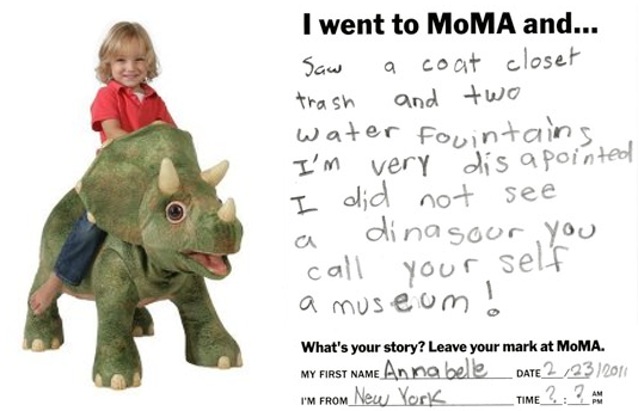Annabelle visited the Museum of Modern Art. There were no dinosaurs. Annaballe was not pleased. We choose to believe this is 100% real. (At Gothamist)