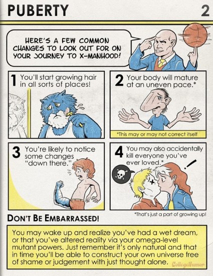 College Humor has an insightful look into the changes that happen during puberty by the X-Men. It’s weird, but it’s okay! It’s just like being a mutant! (via Laughing Squid)