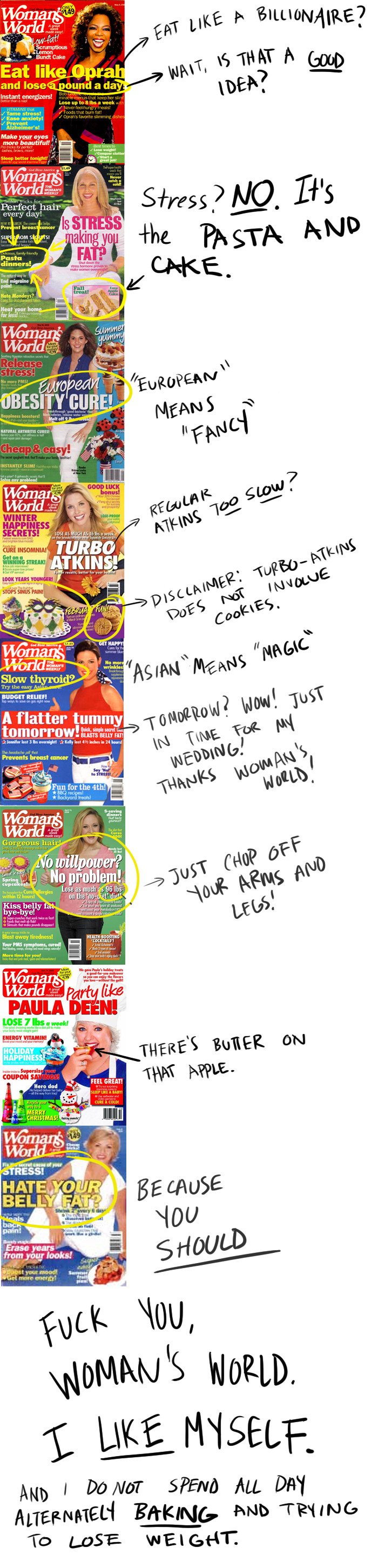 Hate most women’s magazines, especially the ones that teach you how to cook things while simultaneously teaching you about the latest pointless fad diet? Yeah, we do too. Click to enlarge. (Reddit)