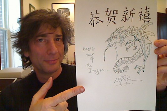 Neil Gaiman has drawn up his own tribute to the Year of the Dragon (a “wobbly dragon”), and we believe this is relevant to your interests. More about this from the author after the jump!