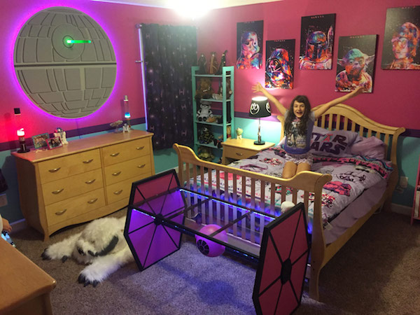I am personally, deeply jealous over the bedroom decor that 10-year-old Emmie and her father Scott were able to put together. Check out all that pink Star Wars majesty! In an interview with StarWars.com, Scott said that starting with the bedding, which came first, “She used that and made the color palette for the room. From there she and I both started looking for items that worked with those colors. She found the prints online and I worked with the artist to get them on canvas,” Scott explains. “The Death Star was her idea, and I just made it and thought it needed to be big and the LED lighting and laser beam would help with the cool factor for the room. Most of the rest of the items were picked out by Emmie.”