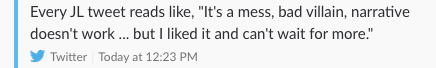 - Some of the first Justice League reactions are in, and while reactions like the tweet below leave me unsure of how to feel, let’s just say it’s cautiously optimistic? Like, maybe we’ll have a good time at this movie even if it’s a narrative mess? It’s unclear why this tweet was later deleted.
