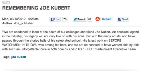 Before editing, this was DC Comics’ official blog post on the death of Joe Kubert. Jill and I responded here, here, and here.