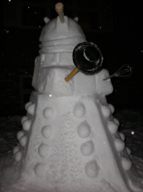 This is a Dalek. Made out of snow. Easily defeated by a hair dryer, and courtesy of the Doctor Who Tumblr account, found on Gail Simone‘s Tumblr account.
