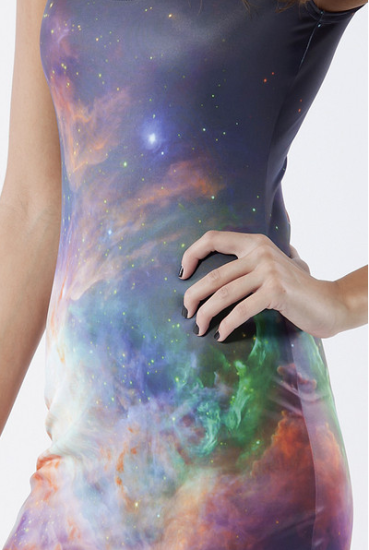Black Milk, makers of the C-3PO and R2-D2 bathing suits, have put out this “Galaxy Rainbow” dress, and while I’m pretty sure it actually depicts a nebula, I’m also pretty sure it’s still pretty pretty. (Fashionably Geek)