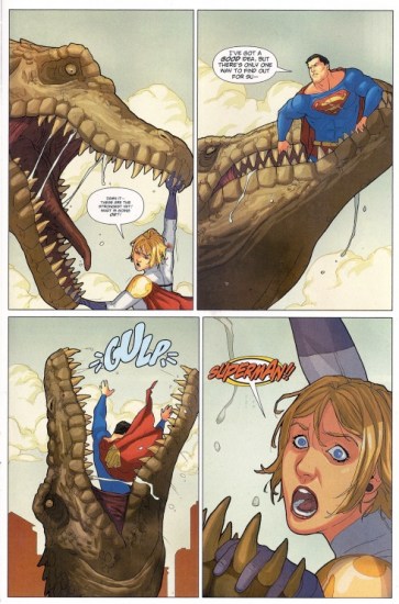 I’m sure you’ve wondered how Superman would handle being eaten by a dinosaur. (From Power Girl #22 via 1979 Semi-Finalist)