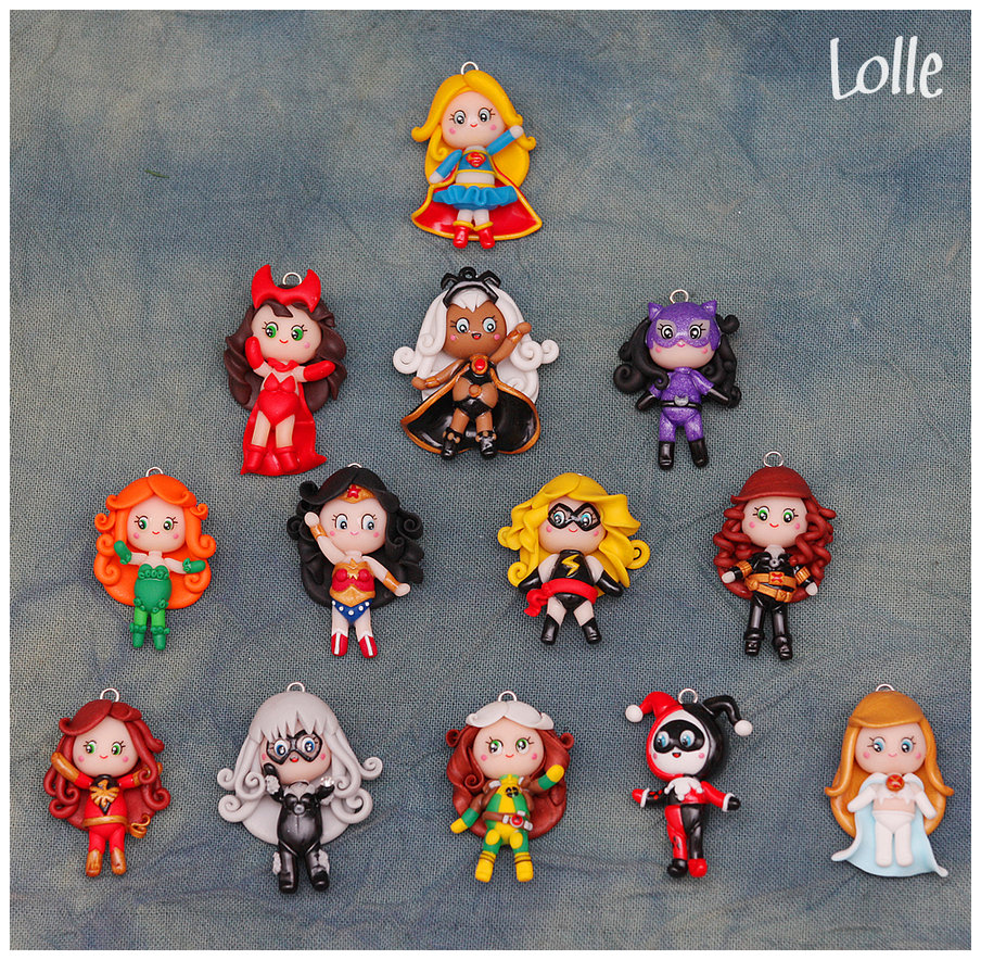 DeviantARTist LolleBijoux has created these adorable dolls with the likenesses of various comic book heroines, and we’d like them to hang out with Polly Pocket in her tiny house.