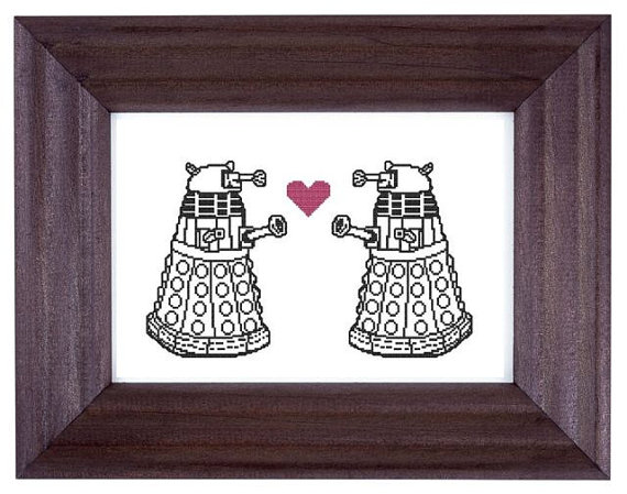 Daleks in love, in cross stich. They will procreate, and later produce more Daleks, to wipe out more alien races — EXTERMINATE! EXTERMINATE! (At So Geek Chic, where you can get the pattern)