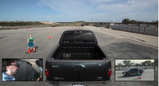 While it’s good fun to watch and must have been good fun to create, it’s a little scary how badly it goes from a ‘not hitting things’ perspective: One of the two testers hit every pedestrian on the practice course — not on purpose — and both of them hit lots of the cones marking the raceway.