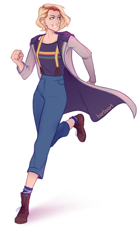 Whittaker’s colorful outfit, with nods to Who Doctors past, became iconic immediately after the BBC released a photo of her rocking those sweet suspenders. Many talented artists took up their pens to draw her thus—and I love that she’s already in action, running (as Doctors do) in all of them: