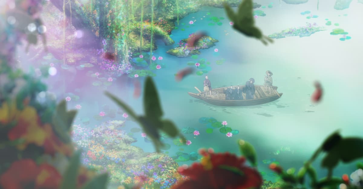 The color palette of the episode so far has been notably gray. But Yamada proposes a deal to Gabimaru: if he can use his village’s ninja know-how to get the Elixir of Life from the lush and beautiful “Paradise,” she’ll give him a pardon. The problem is, no one comes back from Paradise alive. They come back chopped into little pieces in boats filled with beautiful flowers, blooming buds erupting from their eye sockets. Hence the “horror” vibe.