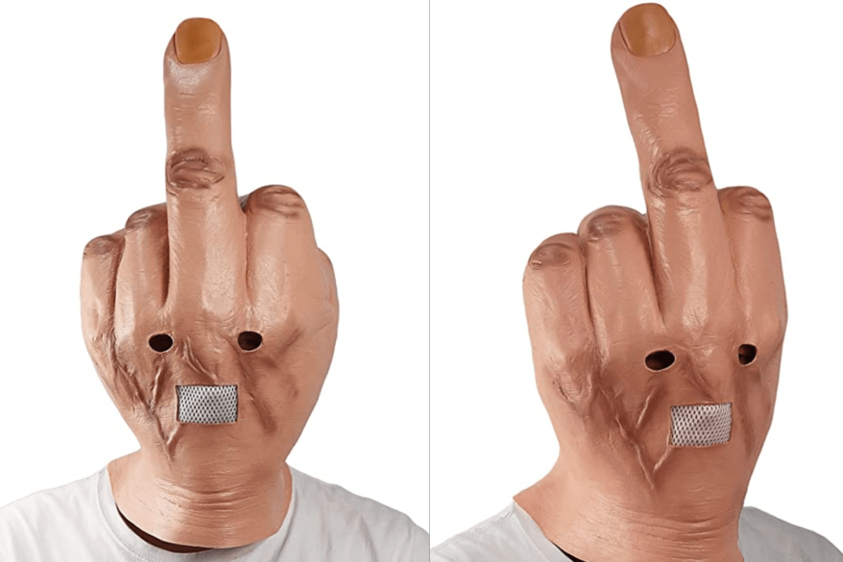 The sad, tired, almost dead eyes. The slumping shoulders. The finger meant to extend in an angry gesture of defiance is slightly deflated. The grimace that is indicative of both a snarl and a yawn. Any hint of facial expression has been worn down into a smooth, slightly greasy finish. The veins that run down the face like scars. This middle finger mask discovered by DesignTaxi on Amazon should be the stuff of nightmares – an absolutely cursed image – but I have much more distressing news. The middle finger mask is us. It is we who are cursed.