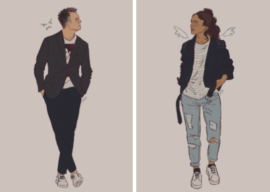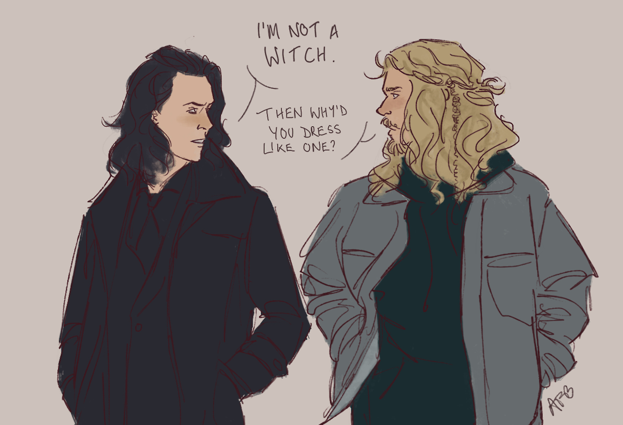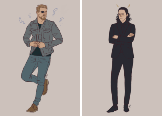 flurgburgler’s depiction of Loki and Thor in their Midgard “street clothes” quickly gained many likes and reblogs on Tumblr. In the movie, the scene highlights the physical differences between the two (high-fashion dark suit for Loki, casual bro wear for Thor), while letting them play out their needling banter.