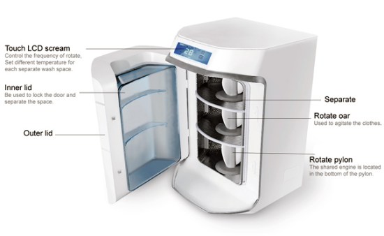 It’s a pain to properly separate clothing by fabric and color: we’ll confess that we often just throw everything into one washer and hope for the best, which is why all of our whites are currently a washed-out pinkish-mauve. This three-shelved washing machine concept, designed by Yali Dai, provides an elegant, energy- and time-efficient solution: each ‘drawer’ can be preset to a different temperature and frequency to optimize the cleaning of different batches of clothes, and an inner lid keeps the different washings distinct. But a shared engine and common space cuts down on the amount of water and electricity you use, all in one-third the time.