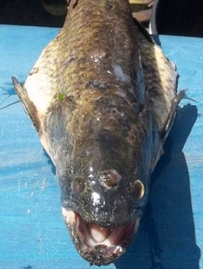 In Cordoba, a group of fishermen caught the above three-eyed wolf fish in a lake near a nuclear power plant. They didn’t notice the fish had the third eye on its head at first, but once they got it under better light, it was a little difficult to miss.