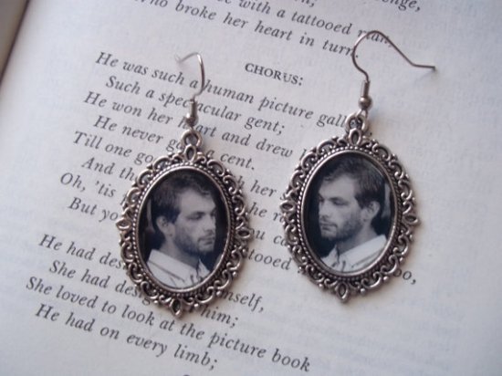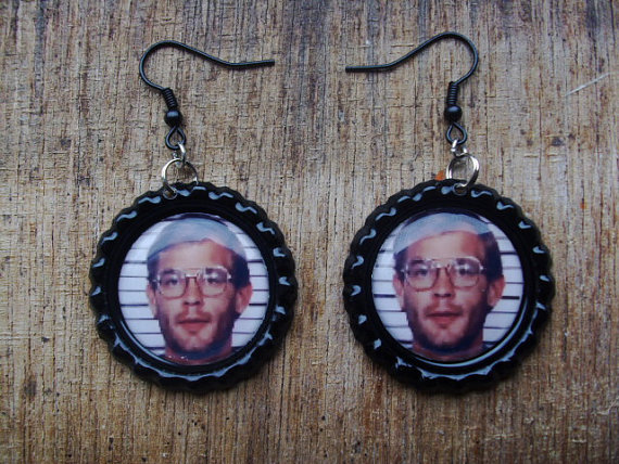 From Liz and Jordan, on Etsy, these next Dahmer earrings don’t feature his mugshot, but a different picture of the serial killer without glasses. They earrings are oval in shape, with the 1.5-inch pictures set in a 2-inch Hypoallergenic silver frame. They run $14.99, with an added $2.50 shipping to the U.S., $4,99 to Canada, and $6.99 to everywhere else.