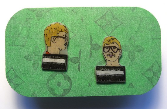 From Amanda Shea, on Etsy, these Dahmer bottle cap earrings feature his mugshot. The bottle cap is painted black on the front and left unpainted on the back. They run $12, with $3 shipping to the U.S., $5 shipping to Canada, and $7 shipping to everywhere else.