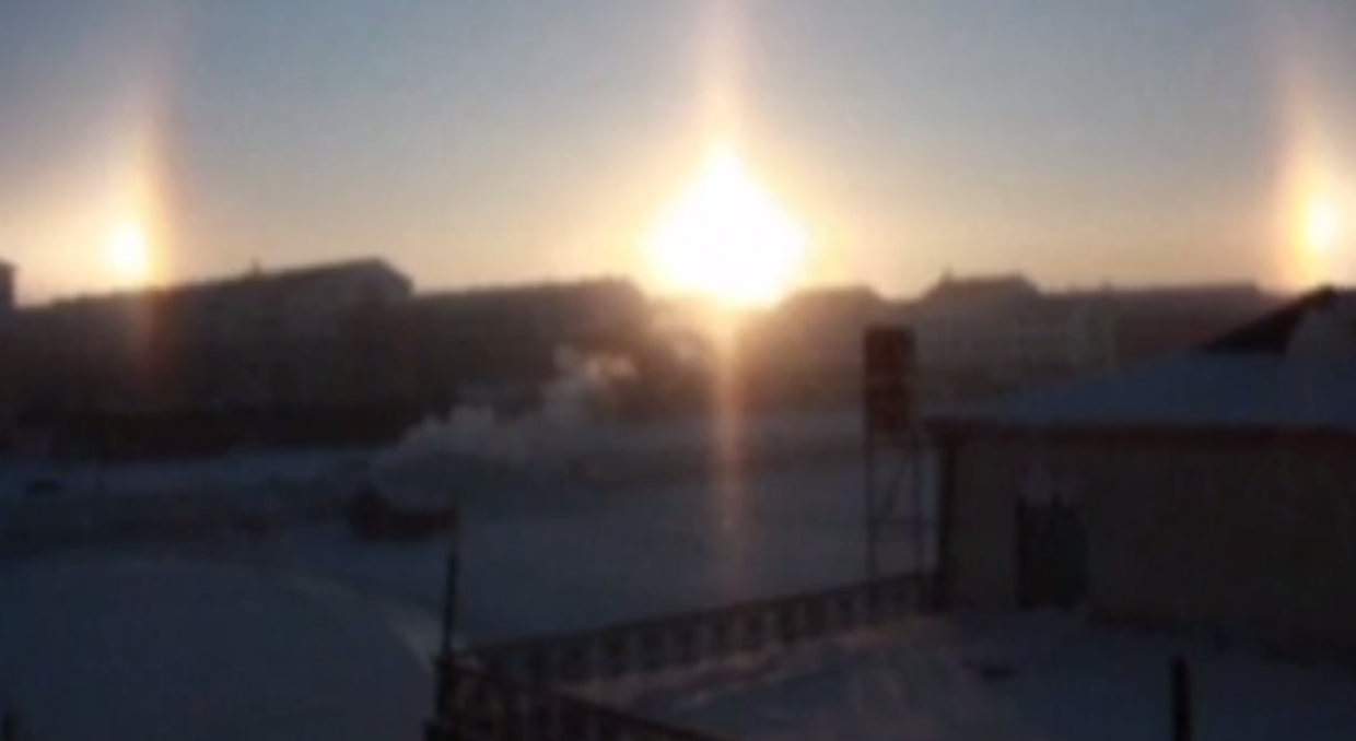Sunshine high up passing through snow crystals is causing a pretty awesome illusion that makes it look like there are three suns on the Mongolian horizon. I bet the people actually witnessing this in person are loving the irony that it’s happening when it’s below 30ºC.