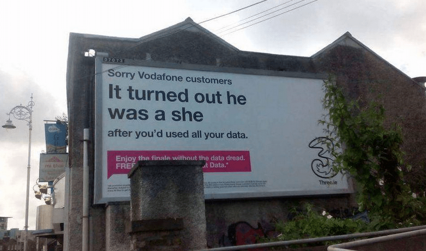 They also pointed out that another ad in the campaign read “Sorry Vodafone customers, Ireland Scored the winning try after you’d used all your data.”