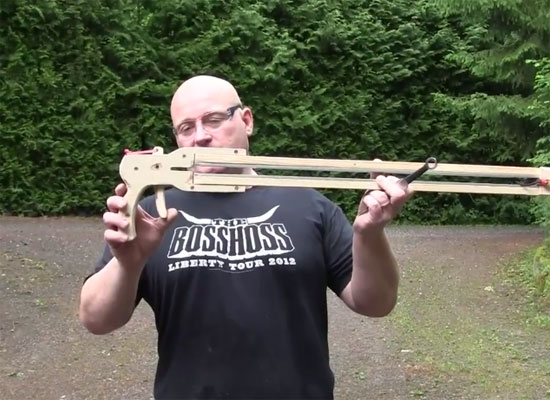 Jörg Sprave first came to our attention with his machette-shooting slingshot some time ago, and has since gone on to wow and horrify us with his DIY weapons. In this new video, Sprave returns to his knife-shooting roots with a crossbow designed to shoot throwing knives. It’s about as dangerous as it sounds.