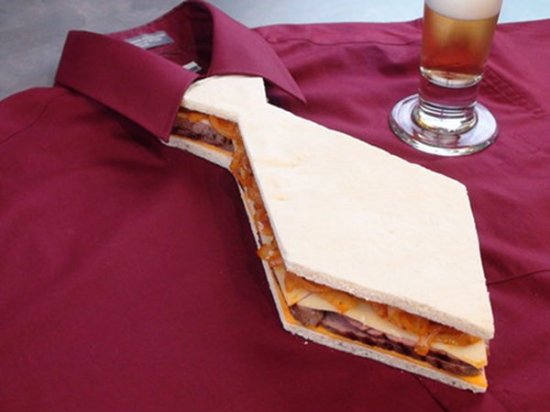 Behold the “Dadwich,” a grilled steak, swiss, cheddar and fried onions sandwich cut into a fashionable tie. Served on a tasteful red shirt with what appears to be a tall frosty one, it’s sure to make any paterfamilias proud. Now if I could just get one in a Windsor knot.
