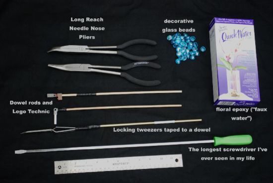 MOCpages user Julia Morley decided to build a LEGO ship in a bottle, mainly because how cool is that. She bought a $7 jug of wine (which she poured down the sink due to it supposedly being awful to drink), filled the bottom of the bottle with glass beads and floral resin in order to create a flat surface on which to work, and made some tools to aid in the ship-imprisoning process. She used LEGO design program Bricksmith to design the ship, then devised a plan to build the ship back-to-front with LEGOs that would fit into the bottle. Being fully aware of the kind of digital voyeur world in which she lives, Morley documented the process with a time-lapse video and posted it for all to see. As the beginning of the video states, the “project took a week of planning, three days of building, a large number of expletives, and some interesting use of very long tools.” Head on past the break to see the custom tools Morley made in order to build encase a LEGO ship in a bottle.