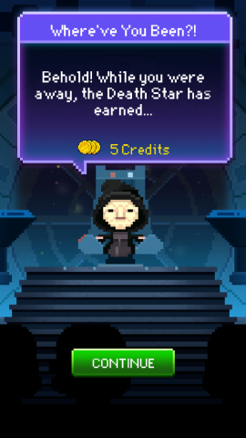 And how adorable are those 8-bit characters? So adorable that I almost like Gungans now — I seriously get excited when I see a creature or character I recognize. And they get obscure — anything from Twi’leks to Arconas. Although, to be fair, not every cutesy addition works. Every time you come back to the game, a little animated Emperor spins around in his chair and tells you how much your Death Star has made while you were away; it’s wonderful at first, but after a while you start to get bored of waiting those precious seconds while he turns around.