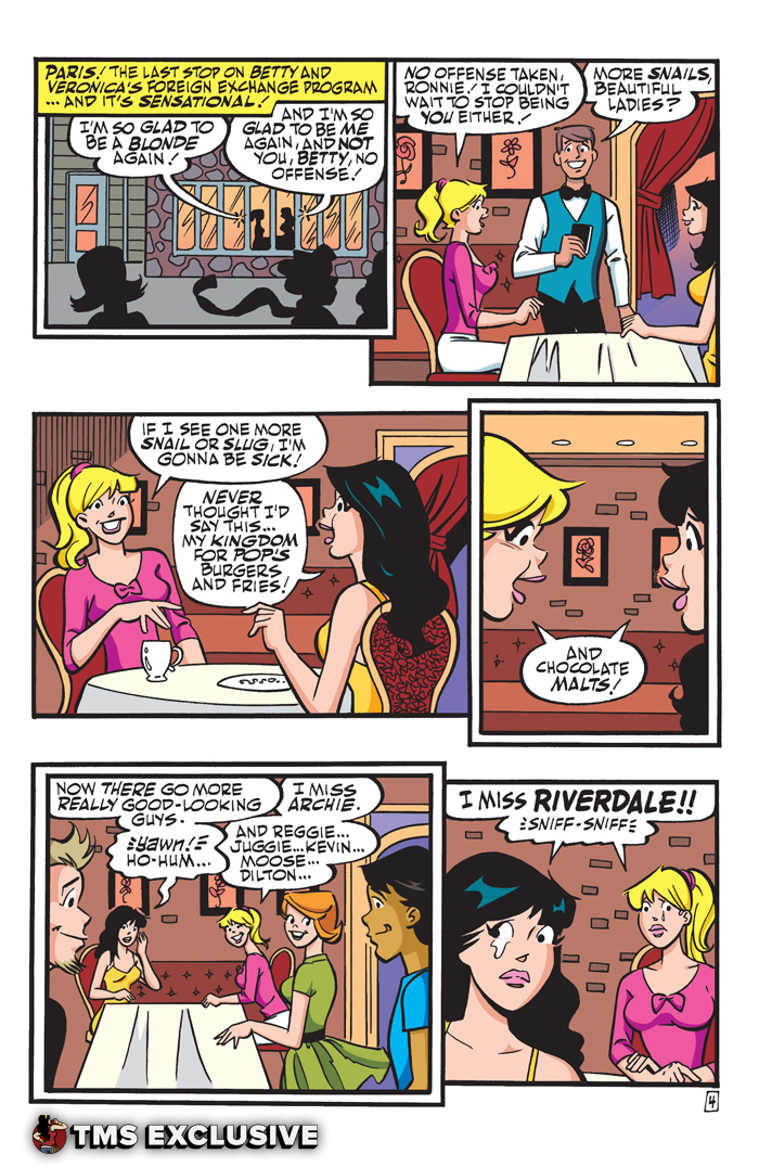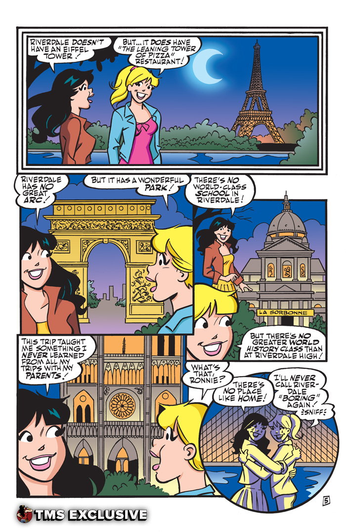 This is it, the final leg of Betty & Veronica’s trip around the world! The BFFs are happy to be back to their old selves in The City of Light—Paris! The girls are enjoying the fine foods and even finer looking gentlemen of France—but what they’d really like is to be back in their hometown! Meanwhile, back in Riverdale there’s a new love triangle brewing between foreign exchange student Banni, Dilton and… Jughead?!! Will Betty and Veronica return to their old routines and familiar faces once their trip is over, or will nothing ever be the same again? You won’t want to miss a minute of this exciting conclusion to “Farewell, Betty & Veronica”!