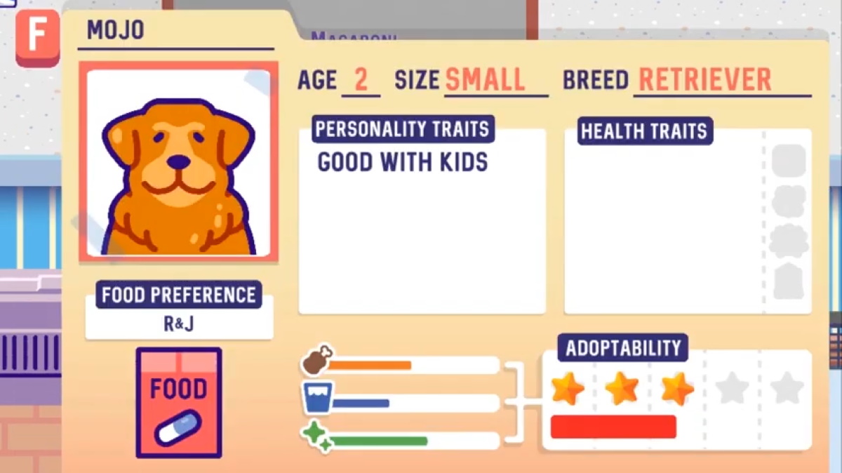 Each dog has its own characteristics and stats because, in real life, every dog is different. There are differences with breeds, with personalities, there are even differences in what each dog eats, and it’s your job to keep track of all of it. The way you spend time with dogs varies, too, from making sure they have water, to playing with them out back to make sure they stay active while waiting for their forever home. Ideally, you’ll get all of their stars up, so that they’re in tip-top shape when it’s adoption time.