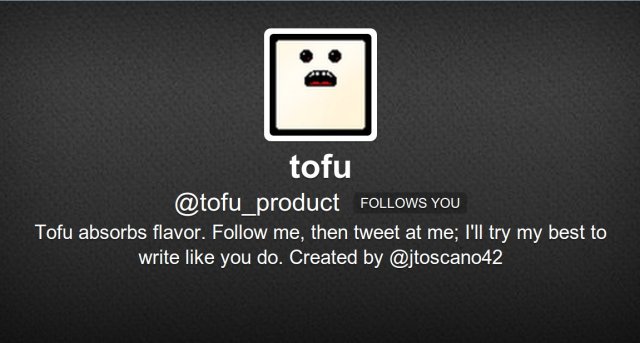 It doesn’t expressly state that @tofu_product is a bot, but from the description “Tofu absorbs flavor. Follow me, then tweet at me; I’ll try my best to write like you do. Created by @jtoscano42” we think that “bot” is a safe assumption to make.