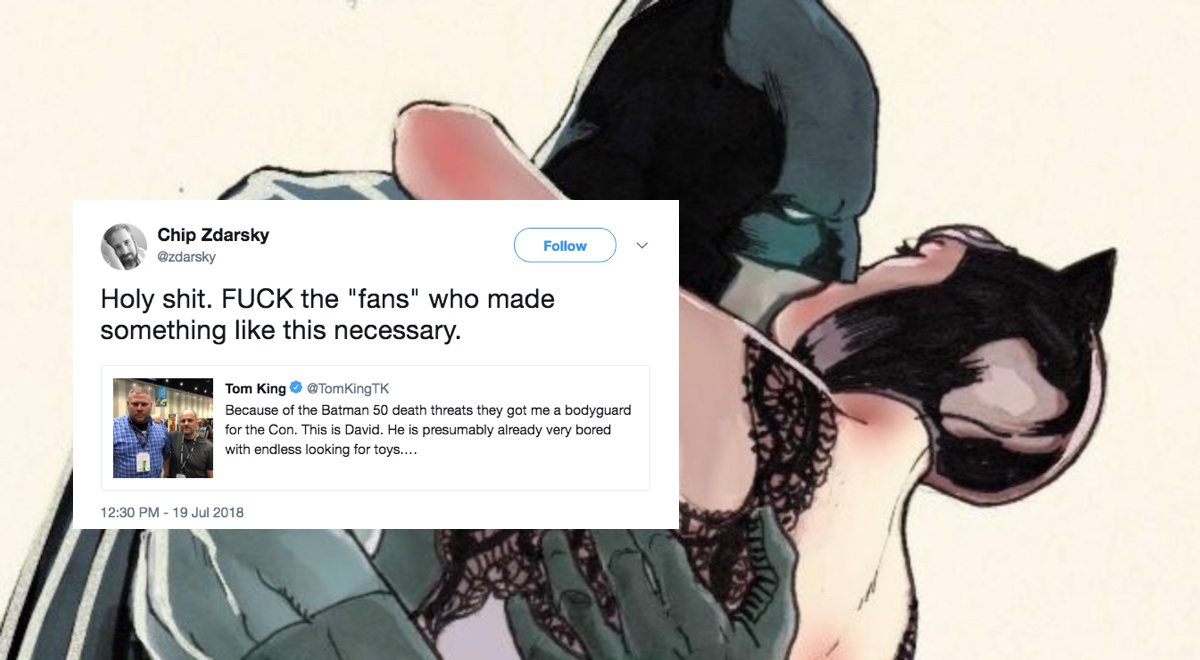 In the San Diego Comic-Con ramp-up, popular DC writer Tom King tweeted a humorous and rather upbeat photo of himself with the bodyguard he’d been assigned at SDCC, because he received threats of death for penning Batman #50, the recent big event book intended to feature the wedding of Bruce Wayne (Batman) and Selina Kyle (Catwoman). King’s tweet was then retweeted by comics writer Chip Zdarksy, who brought the matter to further attention.