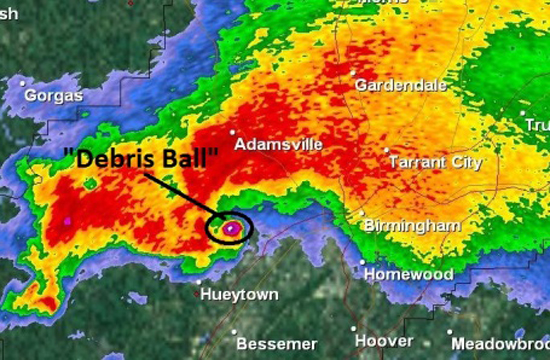 Here’s a reflectivity view from Birmingham (NWS) Doppler around 6:30 pm Wednesday, showing a 1/2 to 1 mile wide tornado. The energy beam from the Doppler is actually reflecting off debris swept up in the tornado.