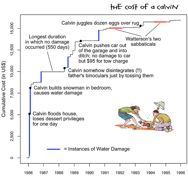 In total, Calvin’s expenses came to $15,955.50, or $1,850.55 per year; according to reference site Homewyse, his most expensive mischief totaled $4,798.83. Michel compiled this handy-dandy chart to explain how Calvin racked up that impressive bill: