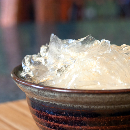 Put chilled baked potato stock into a pot and whisk in the potato starch. Continue whisking the starch and stock together and bring it to boil, forming a gel. Remove from heat.