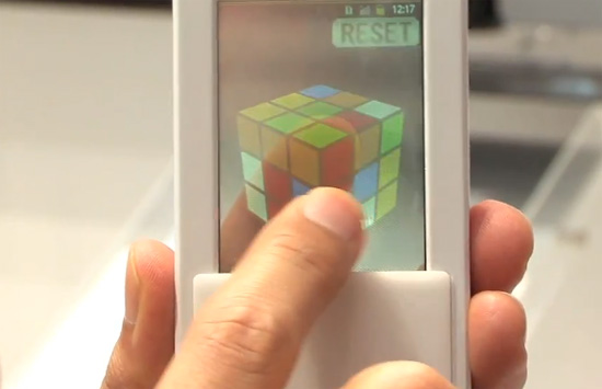 The model also supports simultaneous input from both sides of the screen. This allows the user to pick up an icon, and manipulate the screen around it. In a demo of the device, they also showed off how it could be used to play a Rubik’s Cube game, where one side controlled horizontal motion and the other side controlled vertical motion. Masashi Tagaya, quoted by DigInfo, explains: