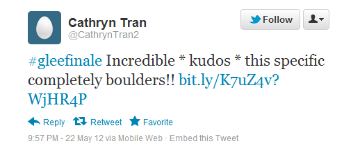 I mentioned before that topic phishers tend to have avatars depicting sexy women. This is not always the case. Some of them keep the default egg avatar and this is a clue that you might have found a real winner. For some inexplicable reason, these topic phishers — a sub-species, if you will — seem way more likely to dish out completely nonsensical phrases with the requisite trending topic and link. These bots, maybe part of a cheaper “buy Twitter spam” package, have a habit of doing things like using “specific” and “particular” as nouns and using the phrase “my spouse and I” to really bizarre ends.