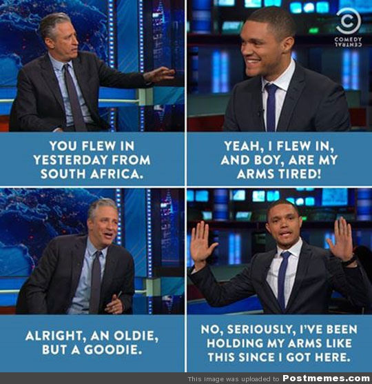 Jon Stewart didn’t spring forth fully-formed on The Daily Show as the Jon Stewart we currently know and love. His voice evolved, until he eventually became one of the most incisive, intelligent interviewers on television—satirical news show, or not—changing politics and media. Noah definitely has huge shoes to fill, but as long as he continues to demonstrate this kind of introspection, this willingness to admit when he’s wrong (rather than talk about how “the jokes don’t land”), and a desire to continually educate himself on his new home and its sociopolitical situations, he just may be exactly what The Daily Show needs. Let’s remember: he’s 31. He was 28 when he made those “jokes.” He was getting pelted by the entire Internet when he was still not used to having a huge platform. He can learn.