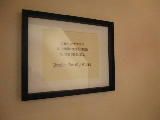 I HAD TO SEE THAT AND NOW YOU DO TOO. Yes, that is a sign that says Trump was “likely conceived” in this particular bedroom, followed by an ominous “The world has never been the same.” Also, framed photos of Trump quotes.