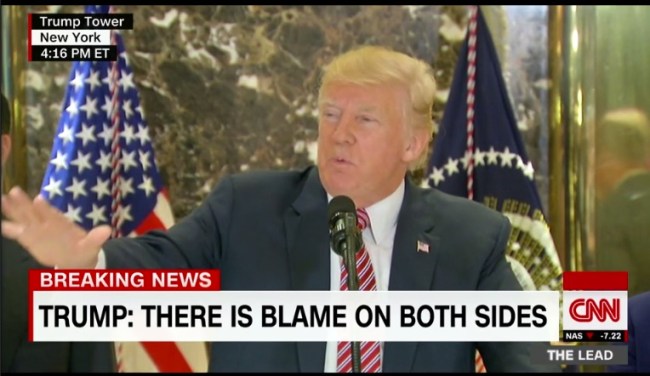 After dancing around the definition of terrorism and spewing some garbage about Steve Bannon being “not a racist,” one reporter pointed out that John McCain has called the violence the fault of the alt-right. And since McCain is now on Trump’s shit list for, as he put it, “voting against Obamacare” (what do words mean, anyway?), Trump apparently thought that was a good line into some firm all-sidesing.