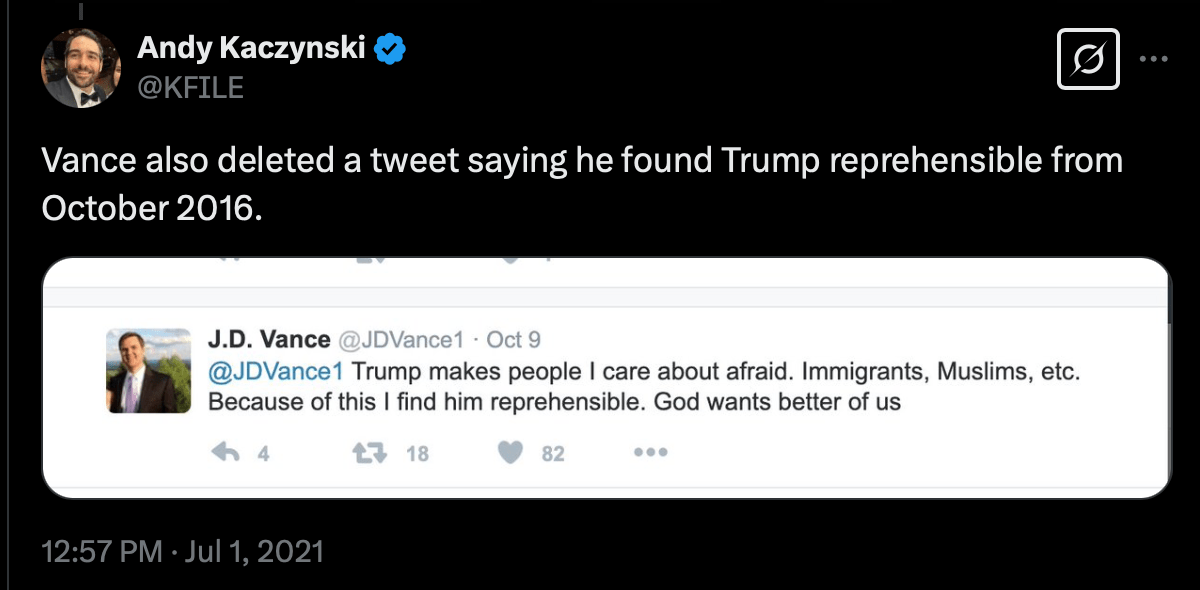 “makes the people I care about afraid. Immigrants, Muslims, etc.” It’s a stunning about face from Vance’s current political leanings, which are in full support of Trump’s plan for the mass deportation of immigrants.