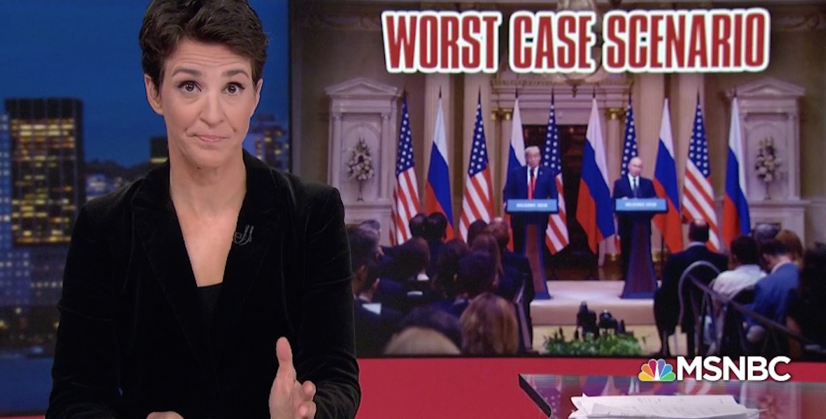 After yesterday’s meeting between Trump and Putin—and this is just based on the public speeches, not the two-hour private meeting between the two leaders—we all may have to reckon with that worst case scenario, which is, as Maddow bluntly puts it, “the possibility that somebody has ascended to the presidency of the United States to serve the interests of another country, rather than our own.”