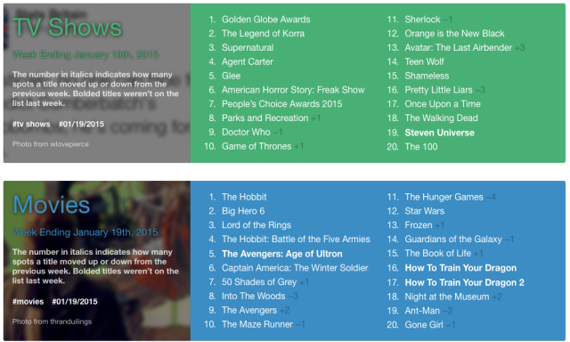 Through an exclusive announcement on The Hollywood Reporter, “Fandometrics”—which is not to be confused with an exhaustive 2014 survey of Supernatural fans that bears the same name— charts the popularity of TV shows, movies, celebrities, musical acts, video games, and “web celebs,” as complied by how many Tumblr users are writing about them on their own blogs. At the end of each week the site will post the results with links that allow you to search each subject, along with a marker which shows how they’ve risen or fallen through the ranks since the previous week.