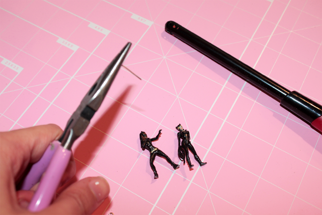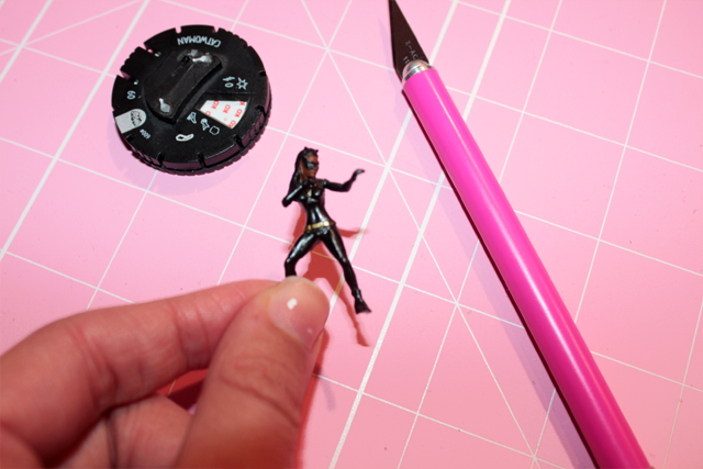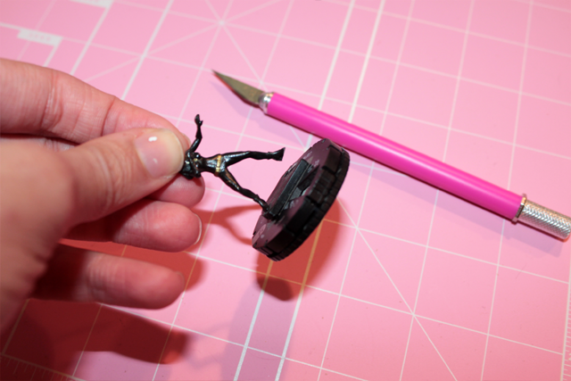 Step 2: Lightly Press your X-acto knife where your character’s foot and the base meet. Slice the sole of their shoe in a single swipe or a slow short slices. Repeat until your character is freeeee.